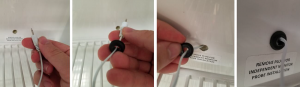 1.打开门,从设备前面开始。在里面,在后壁上,从装置内部取下白色中心盖和黑色 O 形圈垫圈,然后从装置外部(背面)取下它们。不要扔掉黑色 O 形圈垫圈,因为稍后您将需要它们。